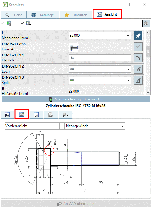 (z.B. Vorderansicht, Seitenansicht) und Darstellungsmodi (z.B. Nenngewinde oder evtl. Kernloch) .