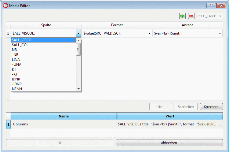 Die Spalten- und Werteausgabe in Tabellen wird über Media Variablen gesteuert. Im Media Editor wird auf die im PARTtemplateDesigner angegebene Variable referenziert.[117]