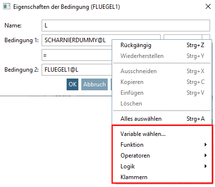 Sie können im Feld Bedingung 1 bzw. Bedingung 2 nicht nur manuell Eingaben vornehmen, sondern auch Formel- oder Variablennamen platzieren. Per Kontextmenü (sekundäre Maustaste) werden umfangreiche Möglichkeiten angeboten: