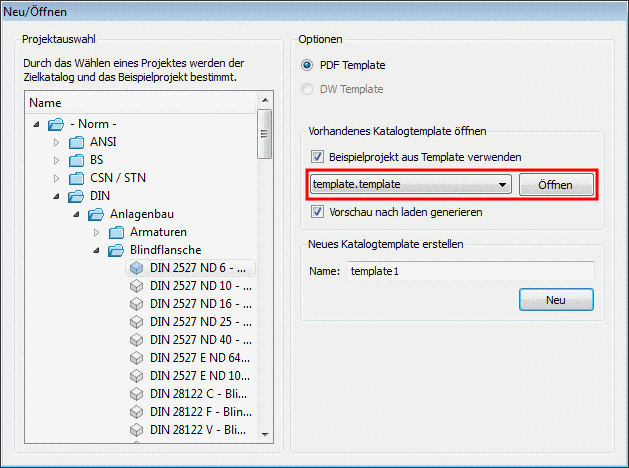 Auswahl über Datei-Menü -> Neu -> Dialogfenster Neu/Öffnen -> Vorhandenes Katalogtemplate öffnen -> Listenfeldauswahl -> :