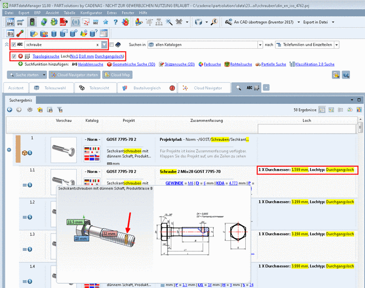 Begrenzen Sie die Suche auf der Registerseite Teileauswahl -> Unterseite Struktur -> Kataloge auf Norm -> ISO -> Schrauben