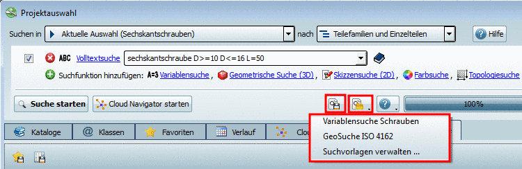 Die wichtige Einstellung für "Suche nach Einzelteilen oder Teilefamilien und Einzelteilen" ist direkt zugreifbar. (Die Einstellung greift auch für die Cloud Navigator Suche [siehe unten].)