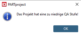 ab QA-Stufe 5 gesetzt werden.Das bedeutet, dass nur Projekte mit QA-Stufe 5 oder höher in einer publizierten Katalogversion sichtbar sein können. Wird bei einem niedrigeren QA-Status versucht die Publizierungsmarkierung zu setzen, erscheint eine entsprechende Fehlermeldung
