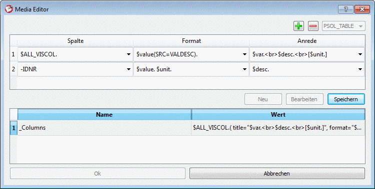 Über die Optionen in den Listenfeldern von Spalte, Format und Titel können Sie bestimmen, welche Tabellenspalten angezeigt werden sollen, welche Angaben im Spaltenkopf gemacht werden sollen (Variablenname, Beschreibungstext, Einheit) und welche in den Tabellenzellen selbst. Detaillierte Informationen hierzu finden Sie unter Abschnitt 10.6.2, „Tabellenvariablen editieren“ und Abschnitt 10.6.3, „Tabellenspalten ausblenden“.