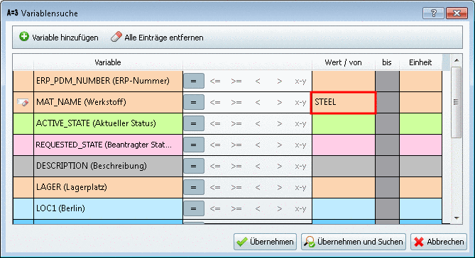 Fügen Sie in der Zeile ERP_PDM_NUMBER als Wert das Platzhaltersymbol '*' hinzu. D.h., beim nächsten Suchlauf müssen die Ergebnisteile zusätzlich eine ERP-Nummer aufweisen.