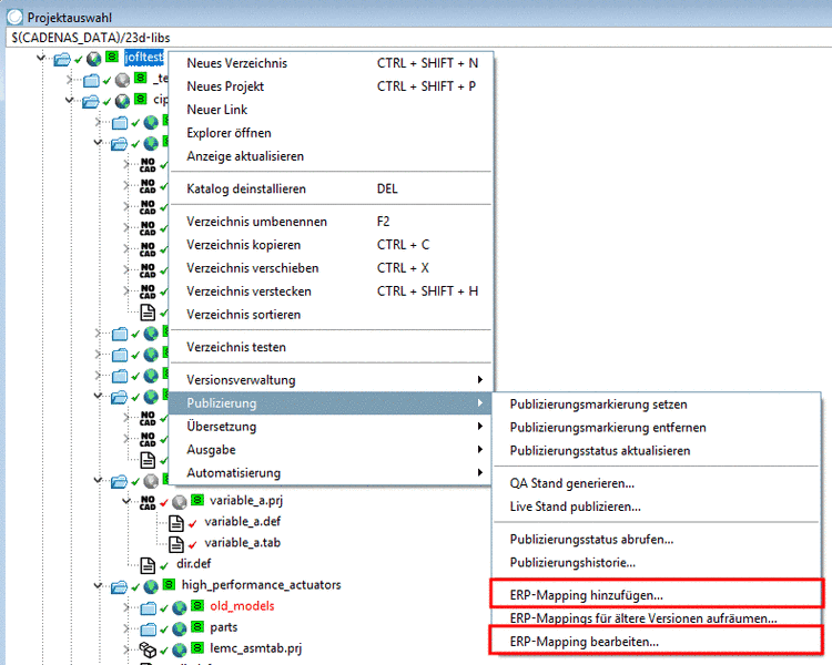 Wenn Sie ein ERP-Mapping aktiv ausführen möchten (entweder vor oder nach einem SVN-Checkin), verwenden Sie hierzu unter Publizierung die Befehle ERP-Mapping hinzufügen... und ERP-Mapping bearbeiten....