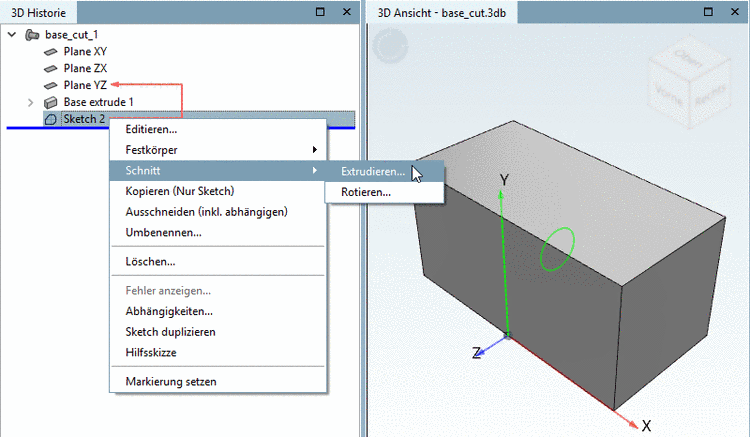 Wählen Sie in der 3D Historie unter Sketch2 den Kontextmenübefehl Schnitt -> Extrudieren....