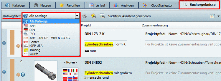 Nach einer Volltextsuche oder Variablensuche wird ein Katalogfilter angezeigt. Wenn Treffer über mehrere Kataloge hinweg erzielt wurden, haben Sie so nachträglich die Möglichkeit die Ergebnisse auf einen bestimmten Katalog einzuschränken.