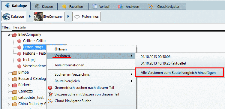 Sofern Sie bei der Kataloginstallation die alten Versionen behalten haben, können Sie über das Untermenü von Versionen die alten Versionen öffnen bzw. zum Bauteilvergleich hinzufügen.