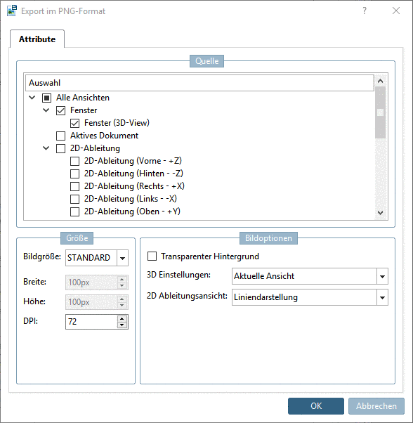 Wenn unter Format die Auswahl PNG getroffen wird, öffnet sich nach Bestätigen der Einstellungen mittels die Dialogseite Export im PNG-Format.