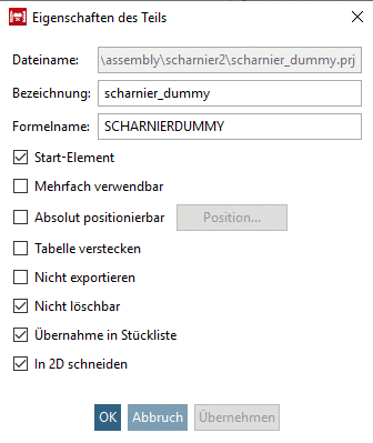 In 2D schneiden: ... definiert, ob das Teil beim Schnitt in 2D mit betroffen sein soll. Entfernen Sie den Haken beispielsweise bei Schrauben, die Sie beim Schneiden nicht schraffiert dargestellt haben wollen.