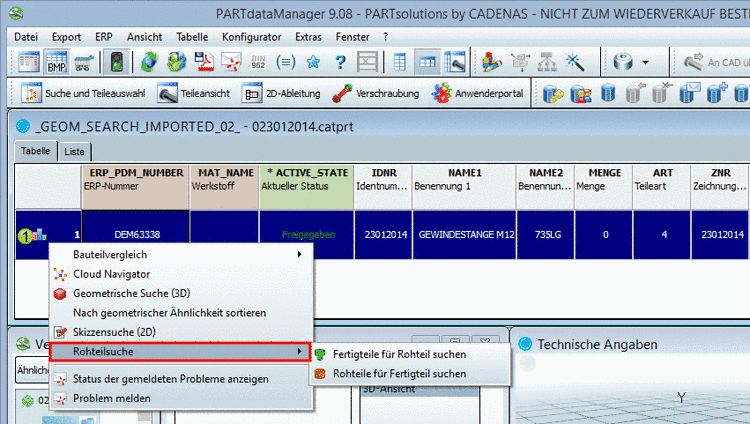 4.2.1.10. PARTdataManager: Rohteilsuche auf Zeilenebene in Tabelle - Anzeige der Liste bereits erstellter Reports im Tooltip
