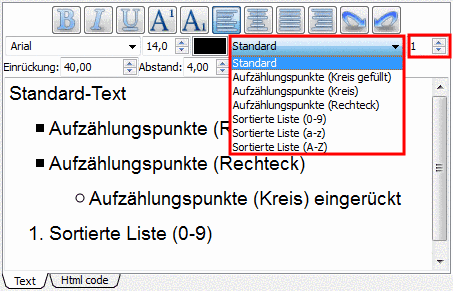 Im Listenfeld für die Absatzformate finden Sie Auswahlmöglichkeiten wie Standard, verschiedene Aufzählungspunkte oder Sortierte Listen. Über das kleine Listenfeld rechts daneben steuern Sie die Einrückungsebene (beginnend mit 0 = keine Einrückung).