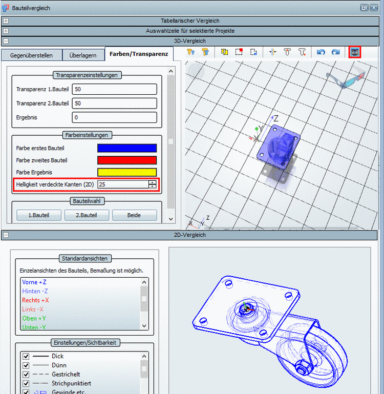 Damit im 2D-Vergleich "Verdeckte Kanten" nicht das Gesamtbild stören, wurde die Helligkeit von diesen per Default auf 25% gesetzt. Über die neue Einstellungsoption im Expertenmodus unter 3D-Vergleich -> Farbeinstellungen -> Helligkeit verdeckte Kanten (2D) können Sie die Helligkeit bei Bedarf verändern.