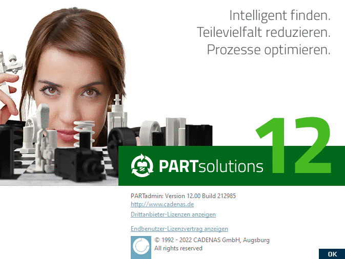 Öffnen Sie mittels Hilfe (?) Menü -> Über (oder F8-Taste) das CADENAS Info-Fenster. Darin finden Sie u.a. Informationen zur installierten Version und Herstellerangaben.