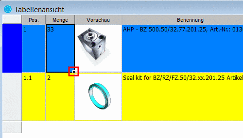 Die aktuell angewählte Zeile ist immer am Blau gekennzeichneten Feld links zu erkennen. Wenn Sie in das blaue Feld doppelklicken, wird - sofern das jeweilige Einzelteil aus PARTsolutions übernommen wurde - der PARTdataManager gestartet und das Teil in der Teileansicht dargestellt.