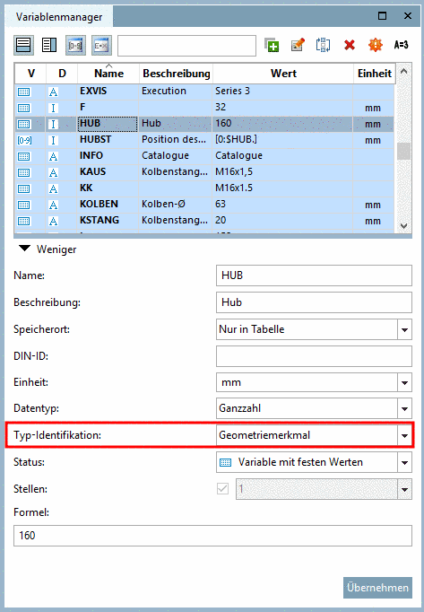 Bei der Stücklistenbezeichnung sind Hub- und Winkelstellungen keinesfalls einzufügen, sonst würde im ERP u.U. für jede Hubstellung eine Bestellung für ein neues Teil ausgelöst werden! | |