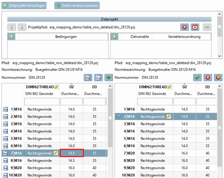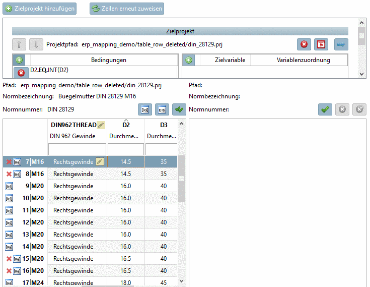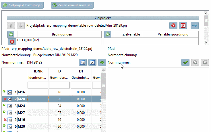 Selektieren Sie Zeilen mit zugeordnetem Zielprojekt -> Rechts wird die Tabelle des Zielprojekt angezeigt. Die korrekte Zeile ist markiert