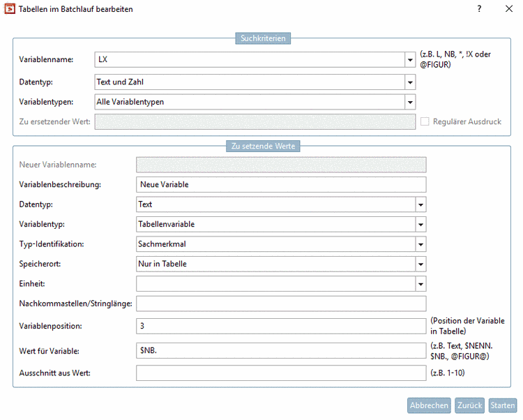 Über Schlüsselwörter lassen sich - und das ist hier im Rahmen der Funktion Tabellen im Batchlauf bearbeiten von Bedeutung - auch Variablennamen einsetzen, denen wiederum feste bzw. Werte anderer Variablen zugeordnet werden können.