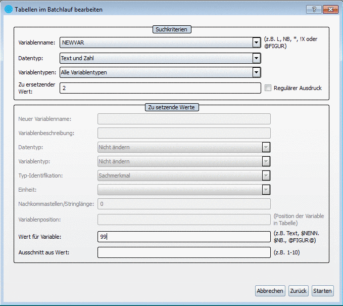 4. Geben Sie unter Zu setzende Werte -> Wert für Variable den neuen Variablenwert (hier „99“) ein.