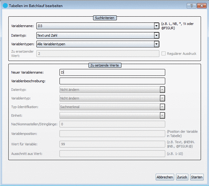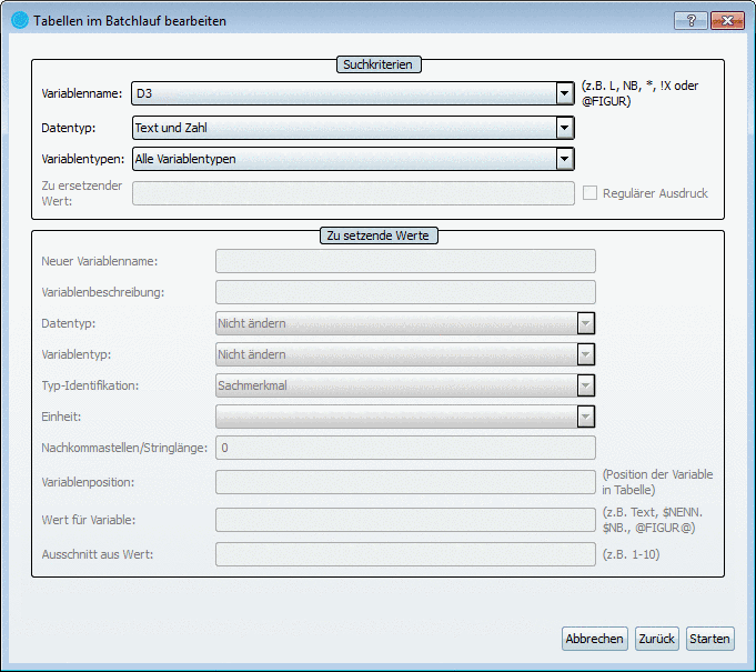 • Alternativ können Sie auch den Platzhalter "*" für alle Variablen setzen. In diesem Fall filtern Sie dann über die Felder Datentyp und Variablentypen.