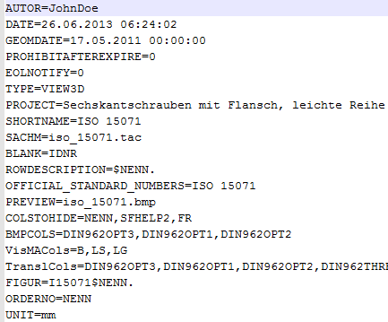 Die Schlüsselwörter sind links vom Gleichheitszeichen aufgelistet (hier: TYPE, PROJEKT, SHORTNAME, usw.).