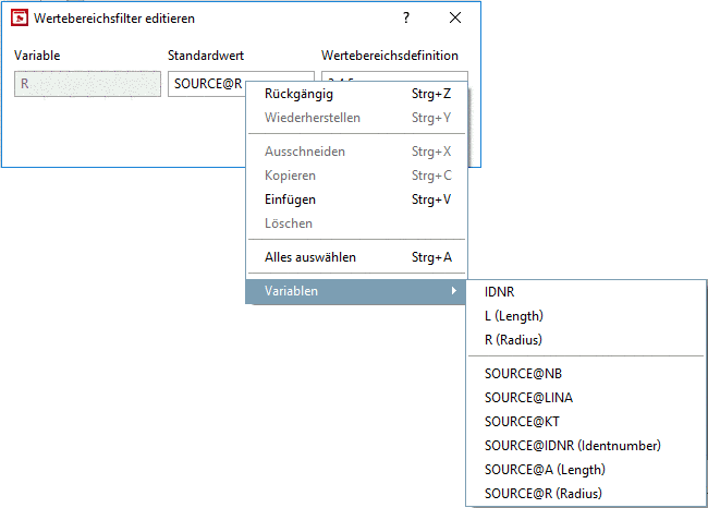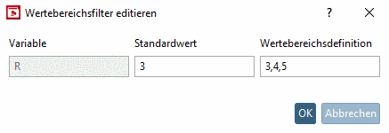 Wird als Variable eine Wertebereichsvariable ausgewählt, öffnet sich das Dialogfenster Wertebereichsfilter editieren. Hier können Sie einen Standardwert auswählen und bei Bedarf die Wertebereichsdefinition ändern.
