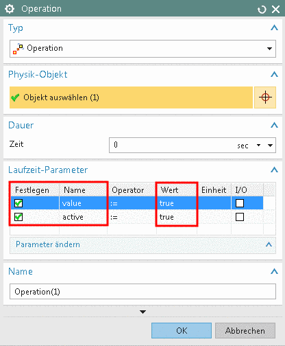 Aktivieren Sie dann im Fenster Operation die Laufzeit-Parameter und bestätigen Sie mit .