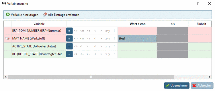 Übertragen Sie die zur Bestimmung der korrekten Ausprägung benötigten Variablen per Pfeiltaste von links nach rechts