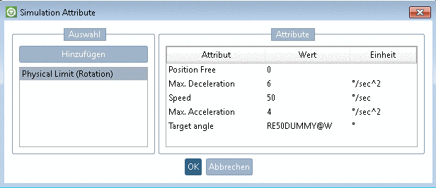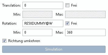 Im Dialogbereich Positionierung muss das Auswahlkästchen Rotation „Frei“ aktiviert sein und die Min- und Max.-Werte müssen entsprechend der physikalischen Begrenzungen des "realen" Produkts spezifiziert werden.