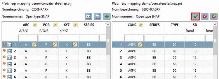 Zuordnung bestätigen : Bestätigt die Zuordnung der selektierten Zeile.