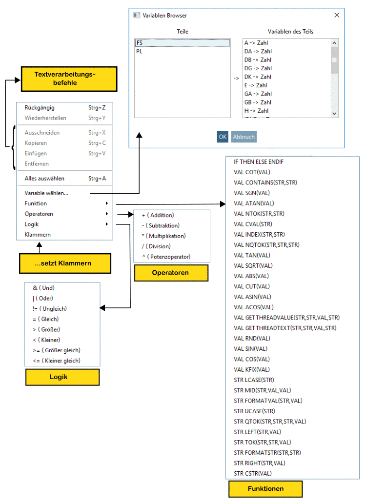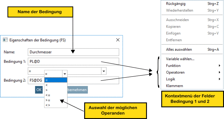 Sie können im Feld Bedingung 1 bzw. Bedingung 2 nicht nur manuell Eingaben vornehmen, sondern auch Formel- oder Variablennamen platzieren. Per Kontextmenü (sekundäre Maustaste) werden umfangreiche Möglichkeiten angeboten: