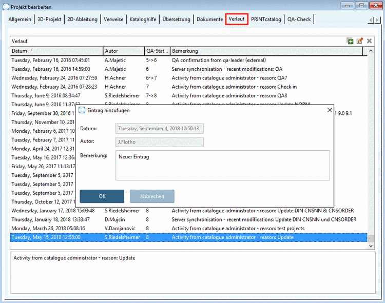 Bei der Katalogentwicklung unter Verwendung von PARTproject QA wird automatisch bei jeder Statusänderung des Katalogs ein Eintrag gesetzt. Nähere Informationen hierzu finden Sie unter Kapitel 6, PARTproject QA.