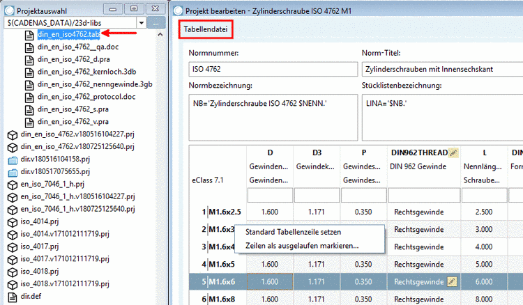 Sobald Sie links unter Projektauswahl im Verzeichnisbaum eine *.tac- bzw. *.tab-Datei selektieren, wird rechts unter Projekt bearbeiten die Registerseite Tabellendatei angezeigt.