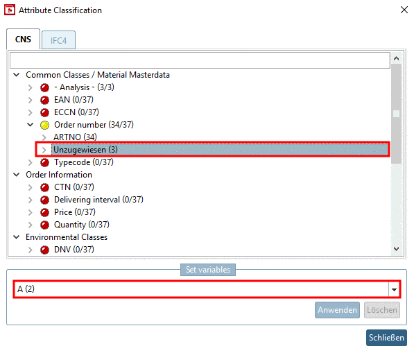 Selektieren Sie in einer Gruppe unterhalb des gewünschten Klassenmerkmals (hier im Beispiel Order number) die Zeile Unzugewiesen.