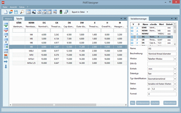 -> In PARTproject ist die Sachmerkmalstabelle der Hutmutter als „einzelteil-projekt.tac“ übernommen. Beim erneuten Klick auf den Button wird nun unmittelbar die neu angelegte Tabelle geöffnet.