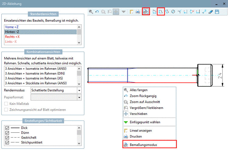 Sie können direkt vor dem Export ins CAD-System einer Ableitung eine Bemaßung zufügen.