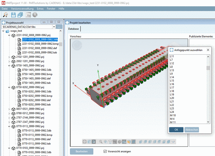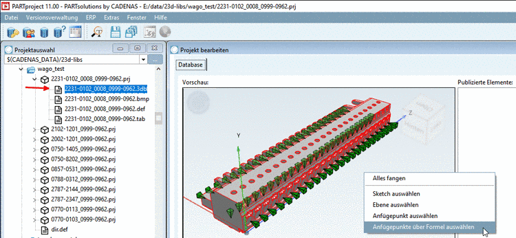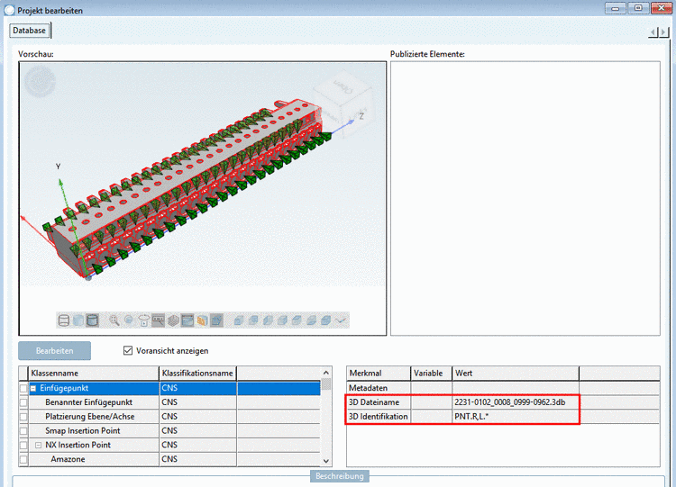 Selektieren Sie die 3db-Datei. Es werden nun alle verfügbaren Anfügepunkte angezeigt. Im Dialogfenster Anfügepunkt auswählen werden ebenfalls alle Punkte angezeigt. Sie können nun einzelne Anfügepunkte klassifizieren, was im vorliegenden Fall nicht sinnvoll wäre, weil eine große Menge von Anfügepunkten genau gleich klassifiziert wird.