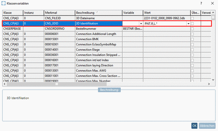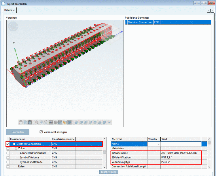 Selektieren Sie unter Klassenname die Option Electrical Connection und aktivieren Sie das Häkchen am Zeilenanfang.