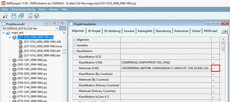 Selektieren Sie die Projektdatei und öffnen Sie mit Klick auf die Merkmale der CNS-Klassifikation.