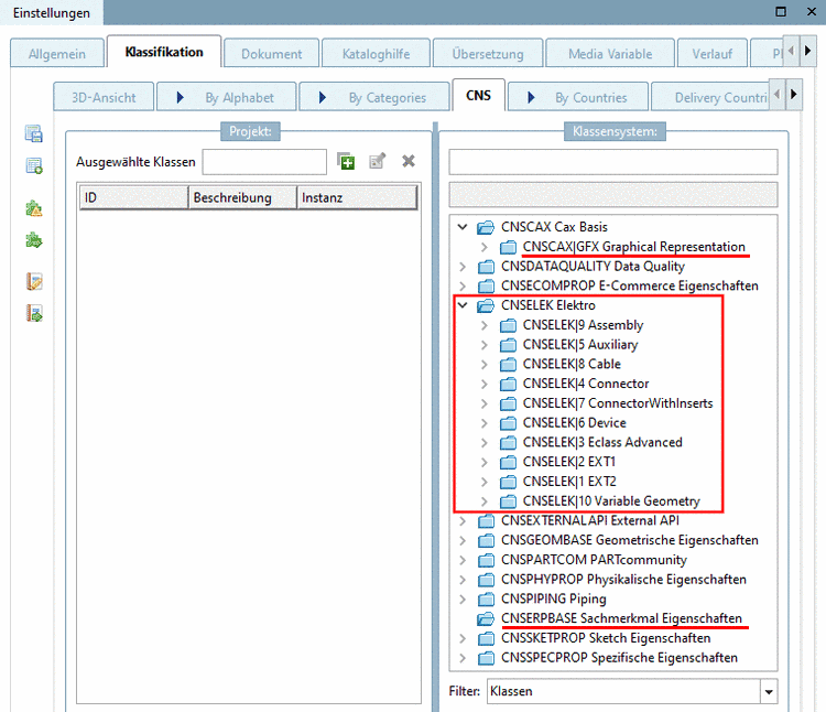 Manche Klassen beziehen sich auf das Bauteil im Ganzen, andere auf spezifische Bereiche wie z.B. elektrische Anschlüsse oder Steckverbindungen. Beim Klassifizieren spiegelt sich dies wider in der Wahl des Filters wie Klassen bzw. Anfügepunkte.