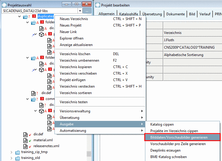 Führen Sie auf dem gewünschten Verzeichnis (Kataloghauptverzeichnis oder Unterverzeichnis) unter Ausgabe den Befehl Bilddaten/Vorschaubilder generieren aus.