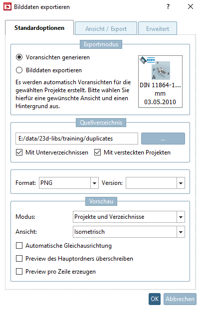 Lösung: Setzen Sie die Zieldatei auf den CADENAS-Standard 400x400 und Farbtiefe 8 Bit. Bei der automatischen Generierung ist dies sichergestellt, wenn Sie unter Bildgröße die Option STANDARD wählen.