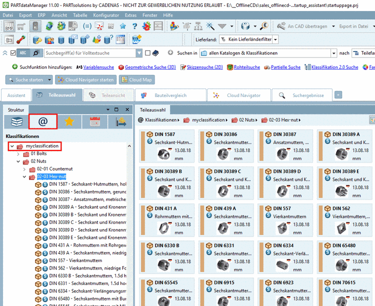 Starten Sie PARTdataManager, wählen Sie die Registerseite Klassen und selektieren Sie Ihre Klassifikation. Die automatisch zugewiesen Bauteile werden angezeigt.
