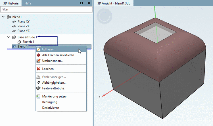 In der 3D Historie können Sie mittels Kontextmenübefehl über dem Blend-Feature mittels Editieren... jederzeit den Dialog wieder aufrufen.