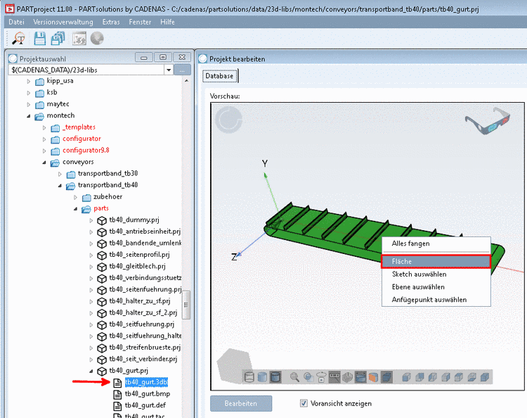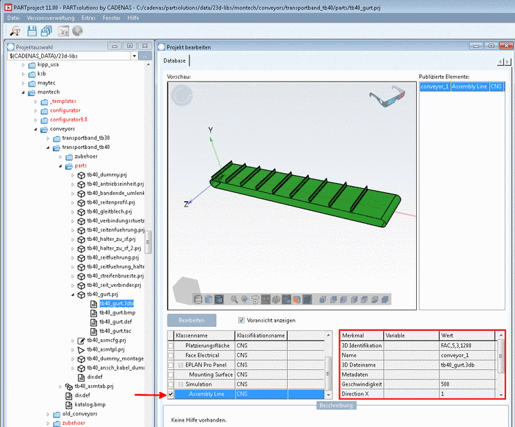 Selektieren Sie im Konfigurator das zu klassifizierende Einzelteil in der Baugruppe (bei einem Förderband den Gurt) und öffnen Sie es mittels Kontextmenübefehl in PARTproject.