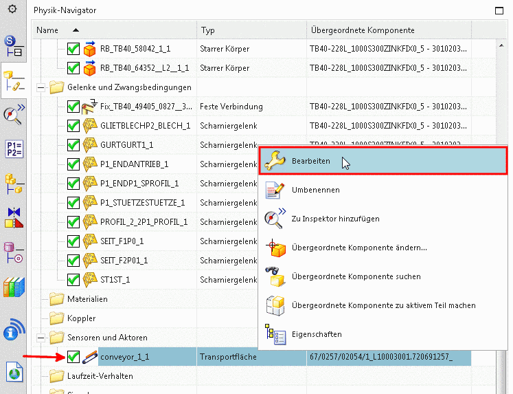 Selektieren Sie im Falle eines Förderbands die Klasse unter Simulation -> Assembly Line.