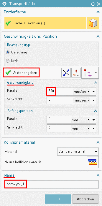Direction: Richtungsvektor für die Förderung. Dieser muss parallel zur Förderbandfläche sein. Setzen Sie X auf 1 und Y und Z auf 0.
