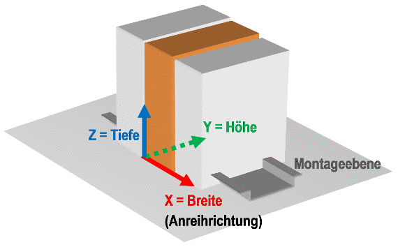 Der Ursprung des Produktkoordinatensystem befindet sich auf der Standardmontageebene des Produktes. Die Standardmontageebene ist eine raumunabhängige gedachte Ebene auf der das Produkt in Normalgebrauchslage befestigt wird.
