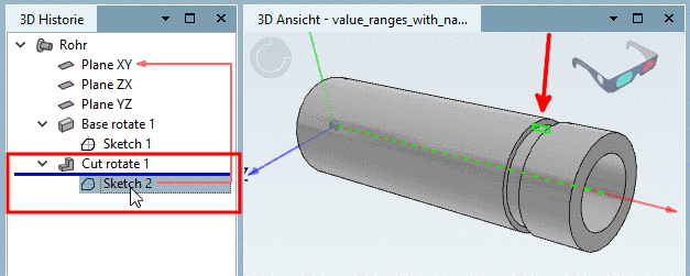 Im dritten Schritt verknüpfen Sie den Schnittsketch mit einer entsprechenden Bedingung, welche in Abhängigkeit von der Werteauswahl der Variablen FORM den Schnitt erzeugt oder weglässt.